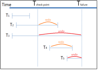 ➃트랜잭션 T4: check point 이후에 실행됐고 failure 시점 전에 실행이 끝났으므로 redo를