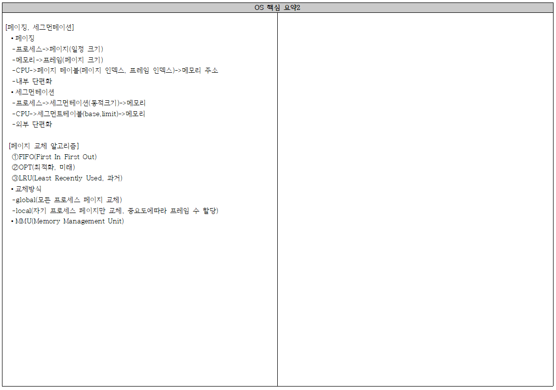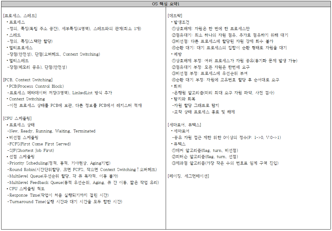 [프로세스, 스레드] ⦁프로세스 -정의, 특징(독립 주소 공간), 세부특징(4영역), 스레드와의 관계(최소 1개) ⦁스레드 -정의, 특징(스택만 할당) ⦁멀티프로세스 -장점(안전성), 단점(오버헤드, Context Switching) ⦁멀티스레드 -장점(메모리 공유), 단점(안전성) [PCB, Context Switching] ⦁PCB(Process Control Block) -프로세스 메타데이터 저장(3영역), LinkedList 방식 추가 ⦁Context Switching -이전 프로세스 상태를 PCB에 보관, 다른 정보를 PCB에서 레지스터 적재 [CPU 스케줄링] ∙프로세스 상태 -New, Ready, Running, Waiting, Terminated ∙비선점 스케줄링 -FCFS(First Come First Served) -SJF(Shortest Job First) ∙선점 스케줄링 -Priority Scheduling(정적, 동적, 기아현상, Aging기법) -Round Robin(시간단위할당, 크면 FCFS, 작으면 Context Switching↑오버헤드) -Multilevel Queue(우선순위 할당, 각 큐 독자적, 이동 불가) -Multilevel Feedback Queue(동적 우선순위, Aging, 큐 간 이동, 짧은 작업 유리) ∙CPU 스케줄링 척도 -Response Time(작업이 처음 실행되기까지 걸린 시간) -Turnaround Time(실행 시간과 대기 시간을 모두 합한 시간) |
