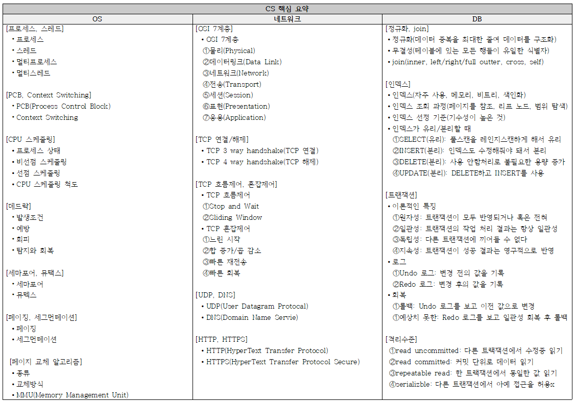 [OSI 7계층] ∙OSI 7계층 ➀물리(Physical) ➁데이터링크(Data Link) ➂네트워크(Network) ➃전송(Transport) ➄세션(Session) ➅표현(Presentation) ➆응용(Application) [TCP 연결/해제] ∙TCP 3 way handshake(TCP 연결) ∙TCP 4 way handshake(TCP 해제) [TCP 흐름제어, 혼잡제어] ∙TCP 흐름제어 ➀Stop and Wait ➁Sliding Window ∙TCP 혼잡제어 ➀느린 시작 ➁합 증가/곱 감소 ➂빠른 재전송 ➃빠른 회복 [UDP, DNS] ∙UDP(User Datagram Protocal) ∙DNS(Domain Name Servie) [HTTP, HTTPS] ∙HTTP(HyperText Transfer Protocol) ∙HTTPS(HyperText Transfer Protocol Secure)